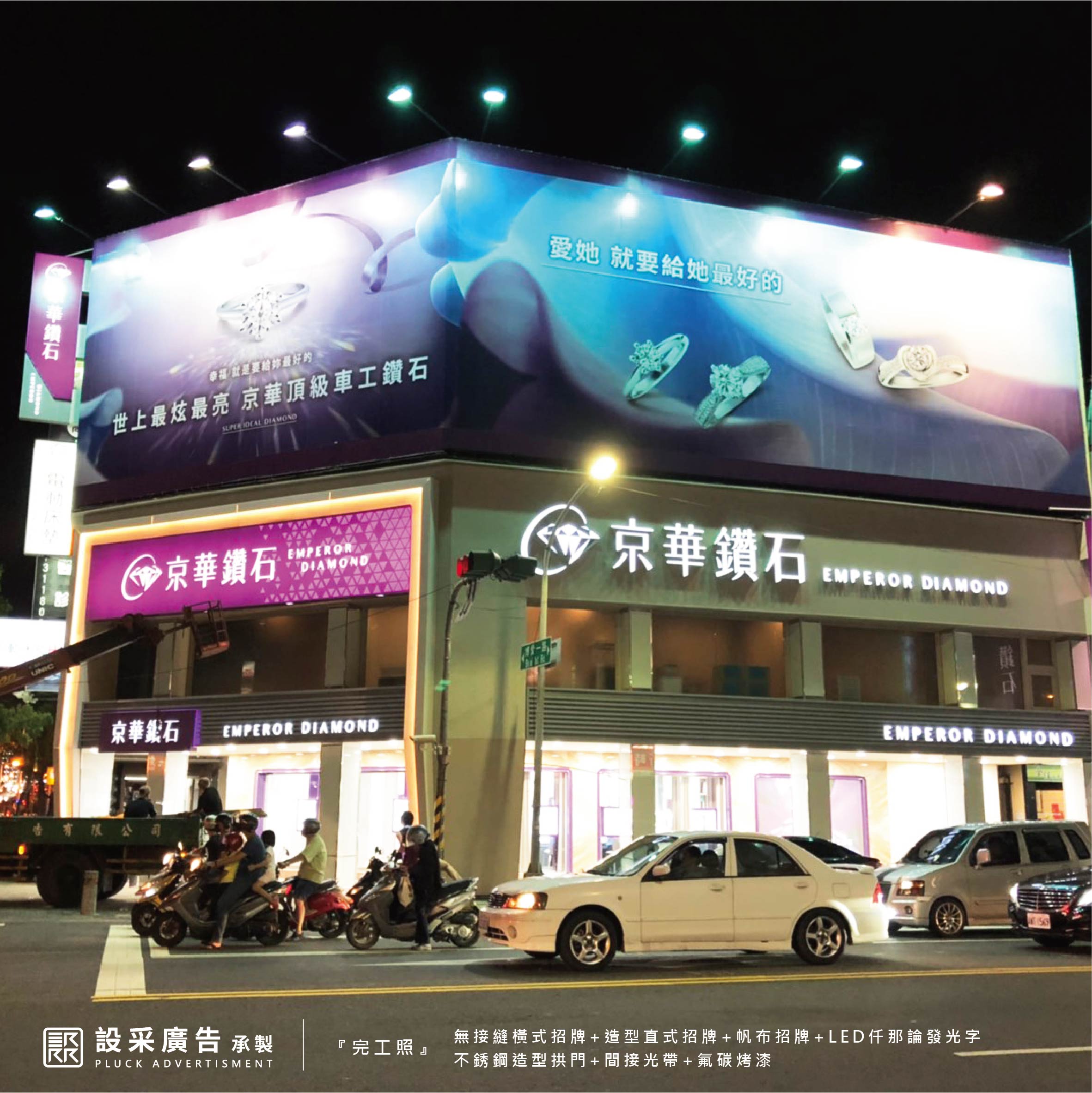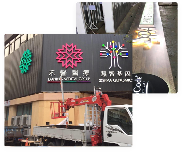 無接縫、氟碳烤漆、LED燈箱、不鏽鋼、壓克力等多種素材皆可製作,優質工法,歷久彌新。