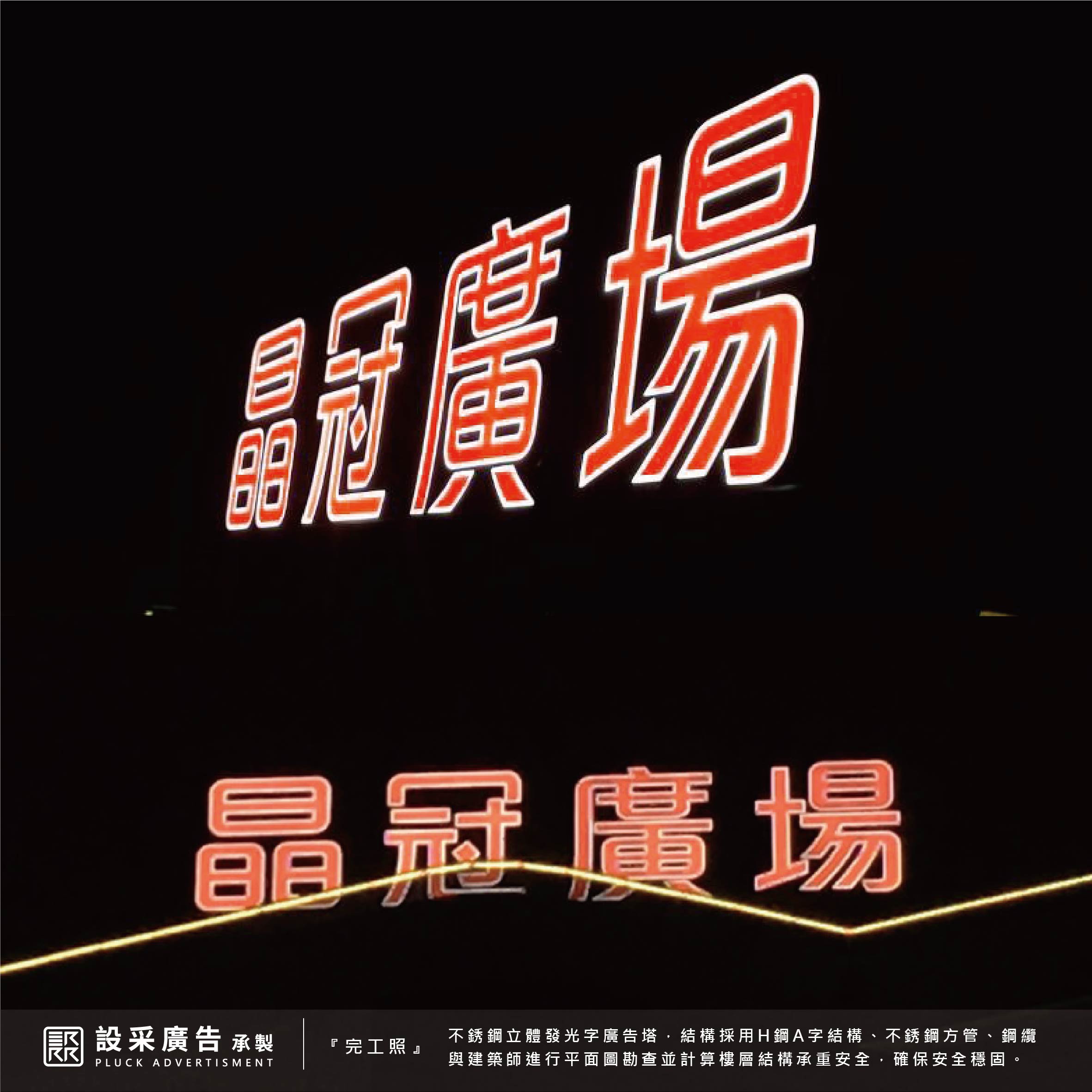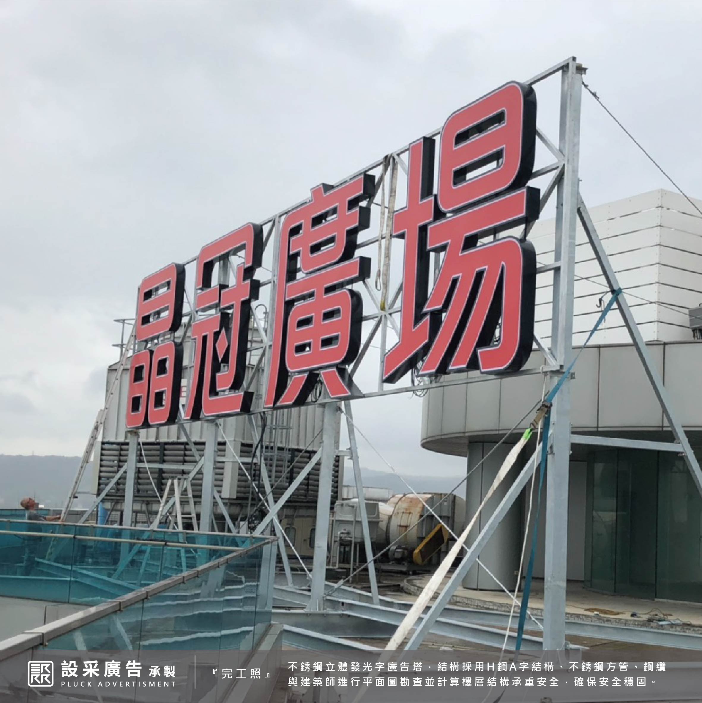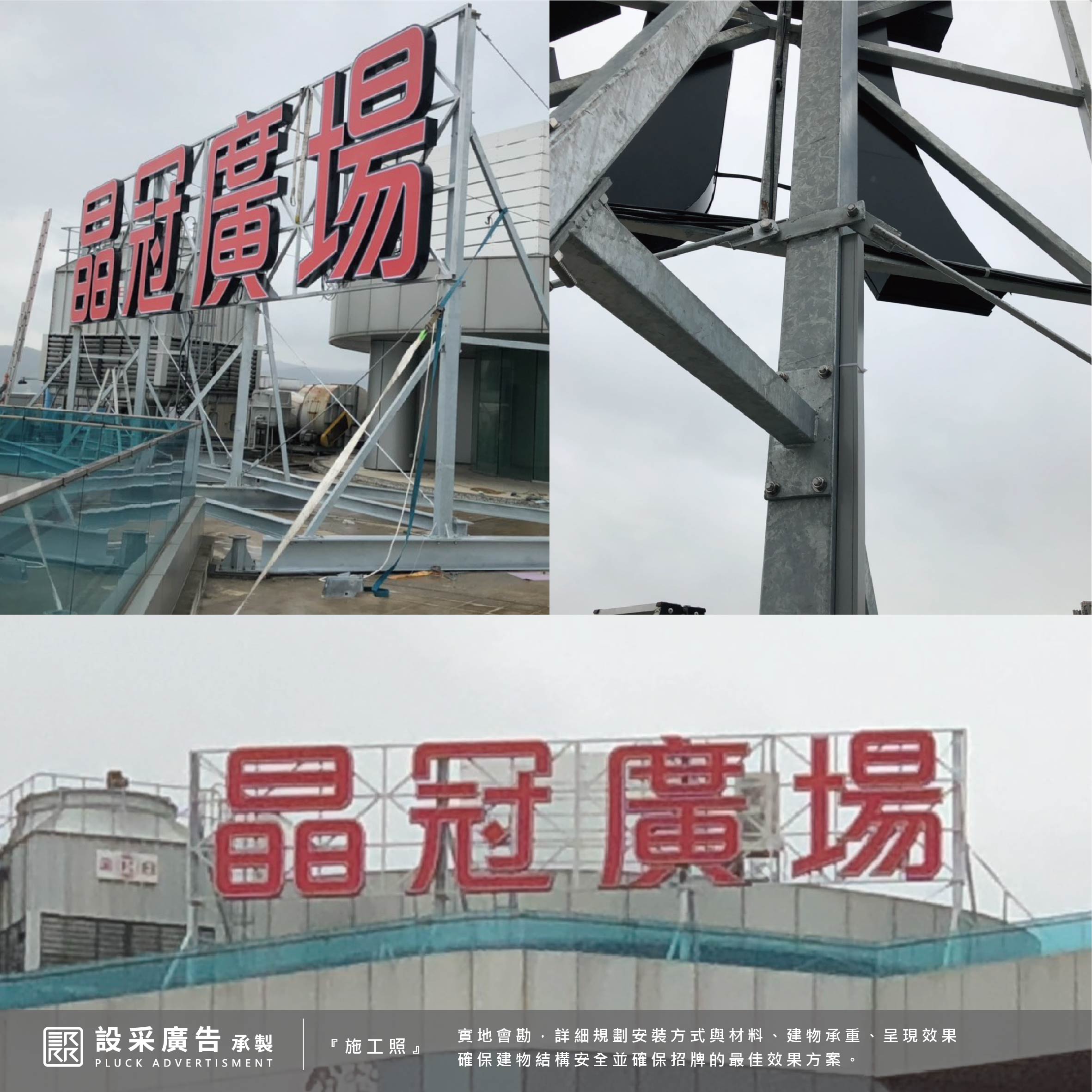 晶冠廣場為新型多元化餐飲、購物商場位於新莊與五股交會之地,緊鄰機場捷運A3站外,周邊也有多條高架道路經過,由於附近幅員遼闊,視野絕佳,因此希望可以於頂樓設置顯眼招牌。