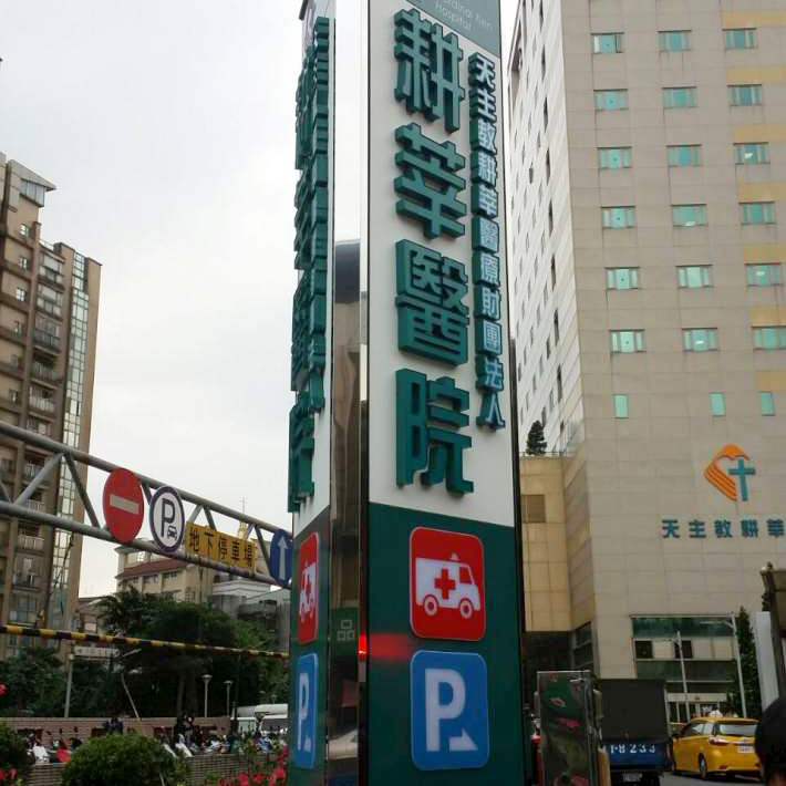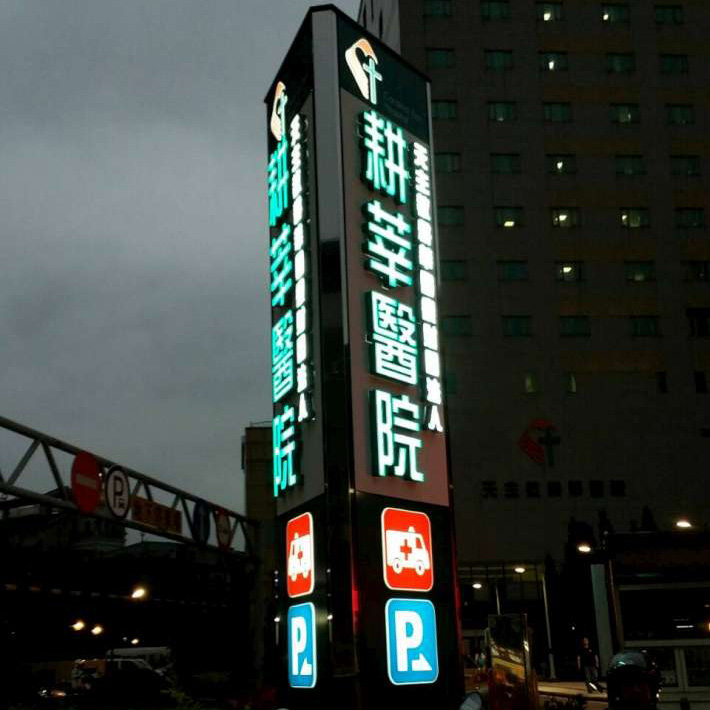 因為有網路推薦的緣故牽起了設采與耕莘醫院的合作,雙方討論時希望可以以堅固及耐用為主,採用不鏽鋼為主體的素材,搭配上立體字與LED燈具,過程中最重要為「放樣」,如何讓業主明確清楚擺設位置,設采招牌工程團隊,採用一比一樣板於預設基地確認設置點位,做好電力需求評估,將地基挖妥,一步步組建好招牌柱,運送至醫院安裝,點亮新店的醫療地標,細心、專業的服務是設采最重要的核心價值。