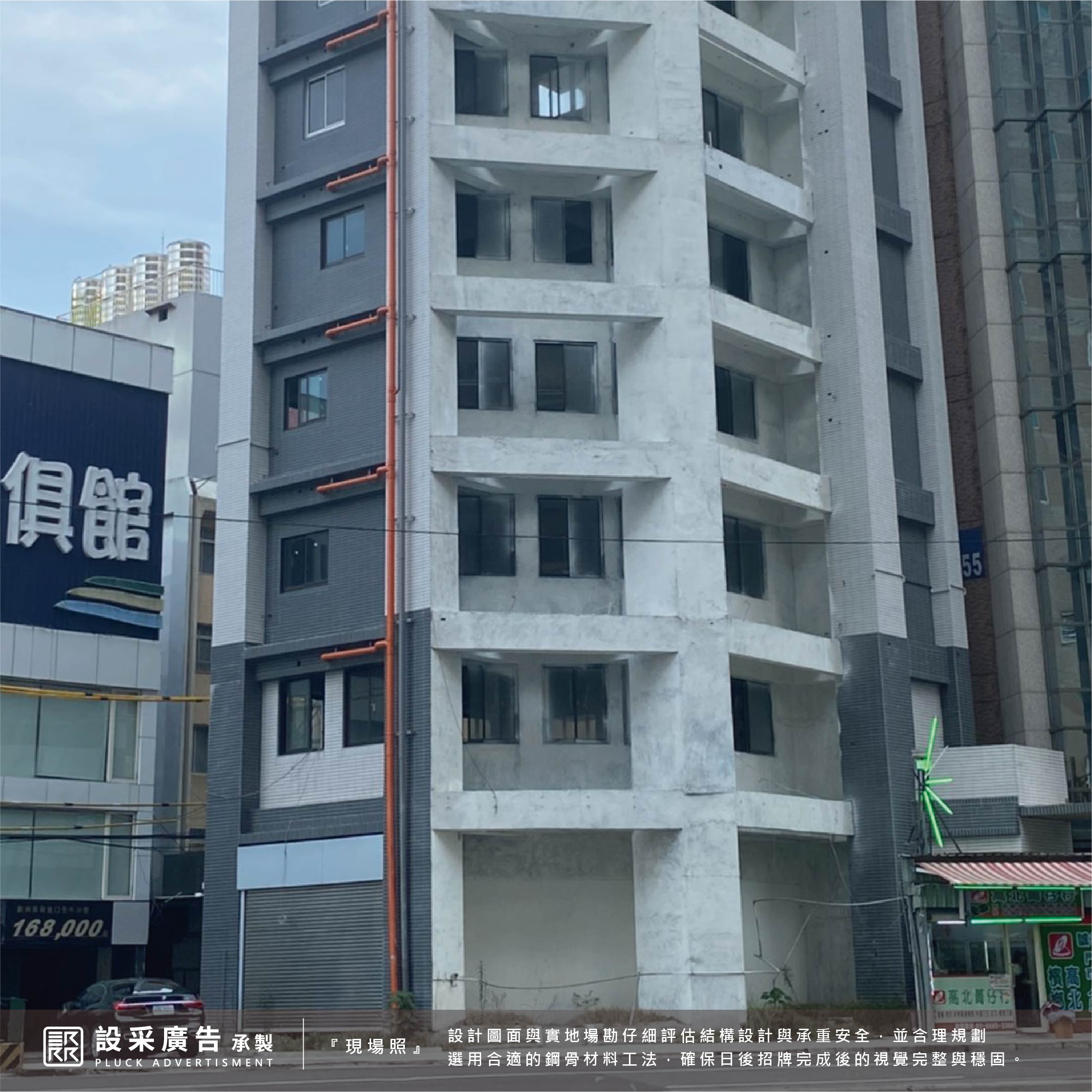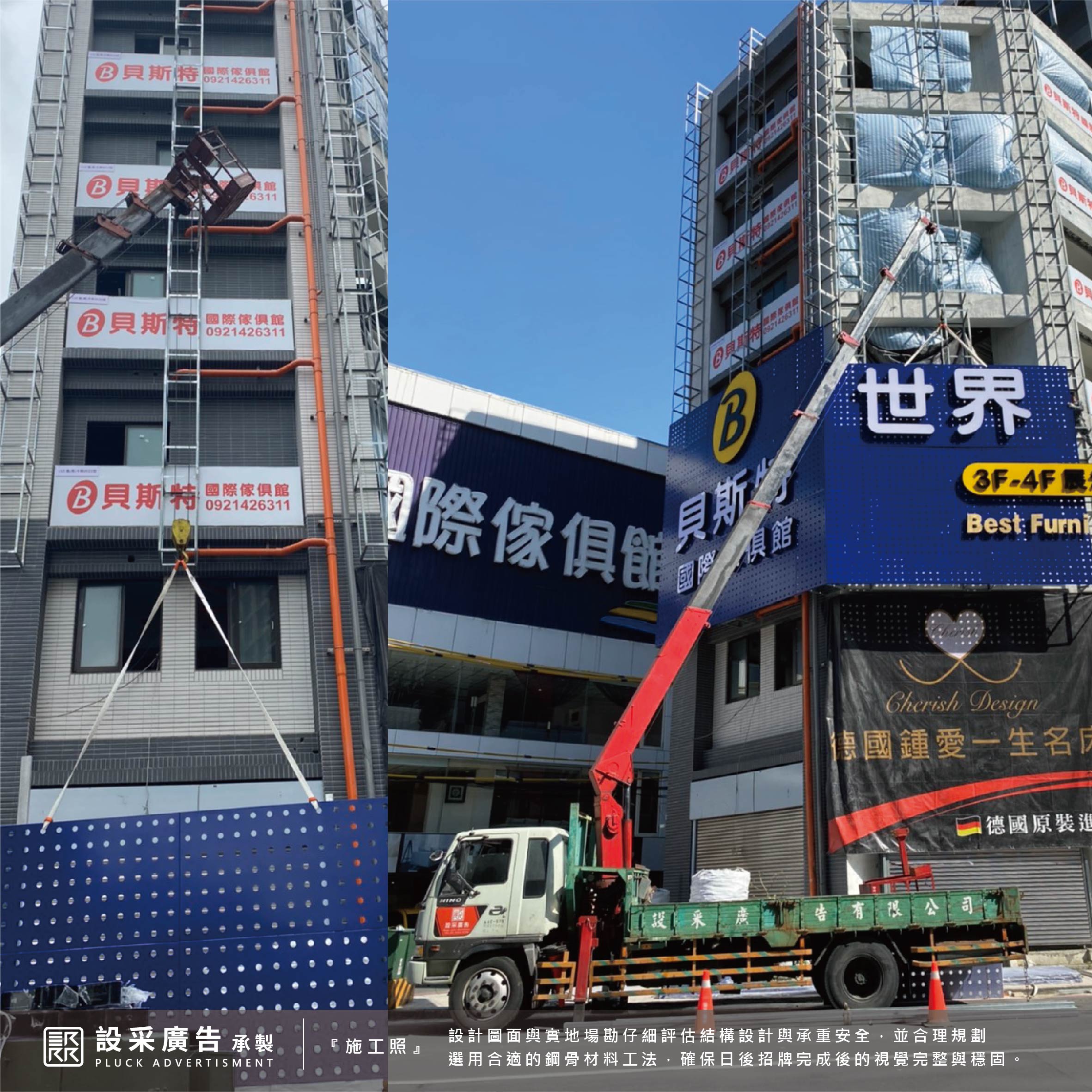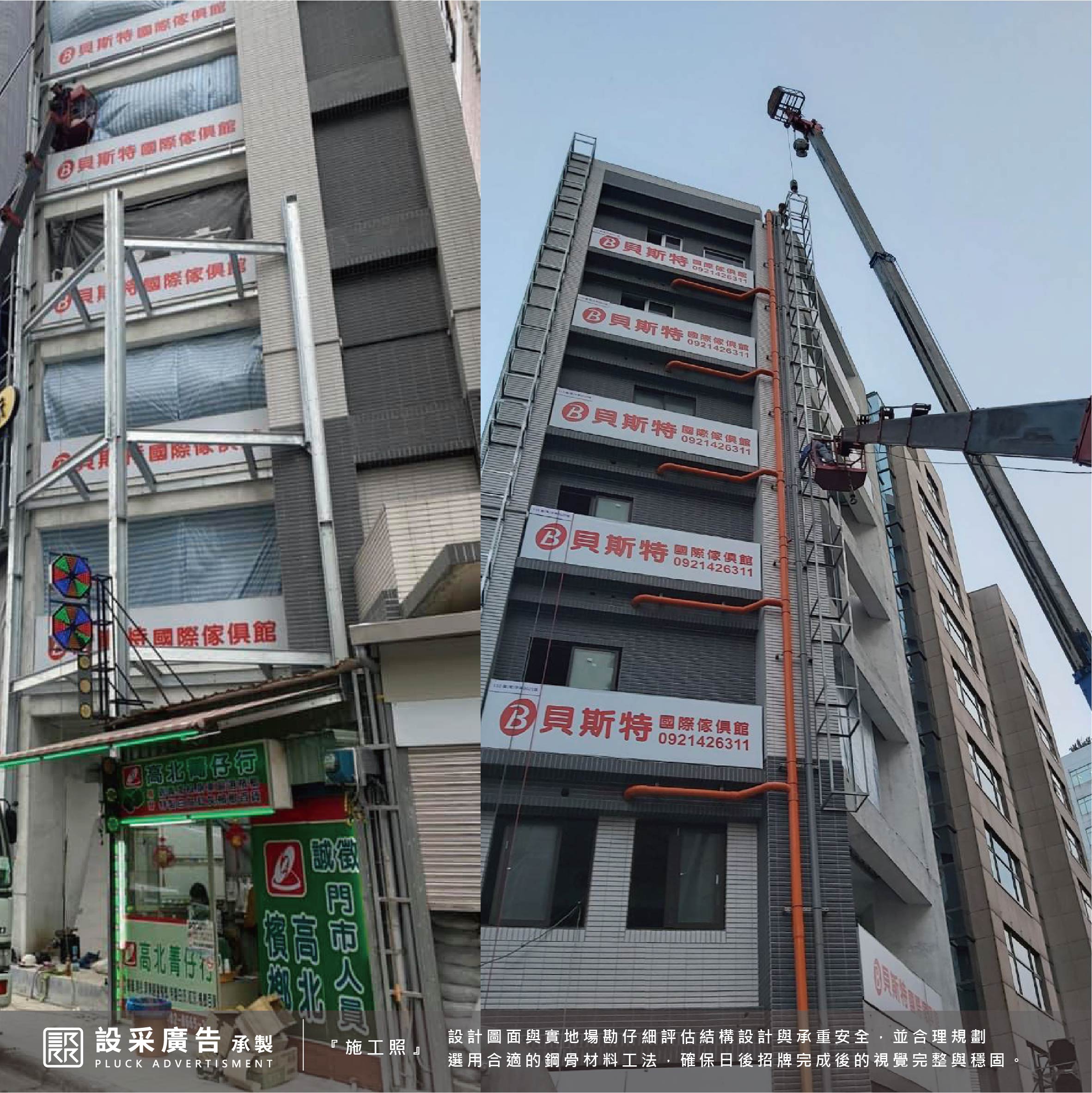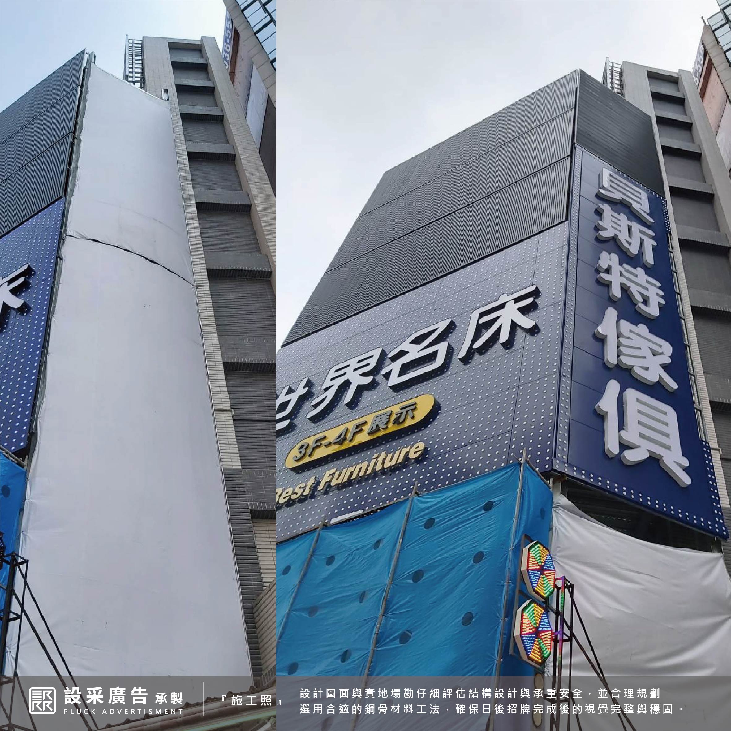 本次合作也是設采招牌工程團隊引以為傲的成果之一,歷時兩個多月的討論、溝通、場勘丈量、定案、施作,其中最重要的必須考量到頂樓的受風面及樓層承載量,鋼骨結構安全,才能打造出堅固又安全的大型廣告招牌。