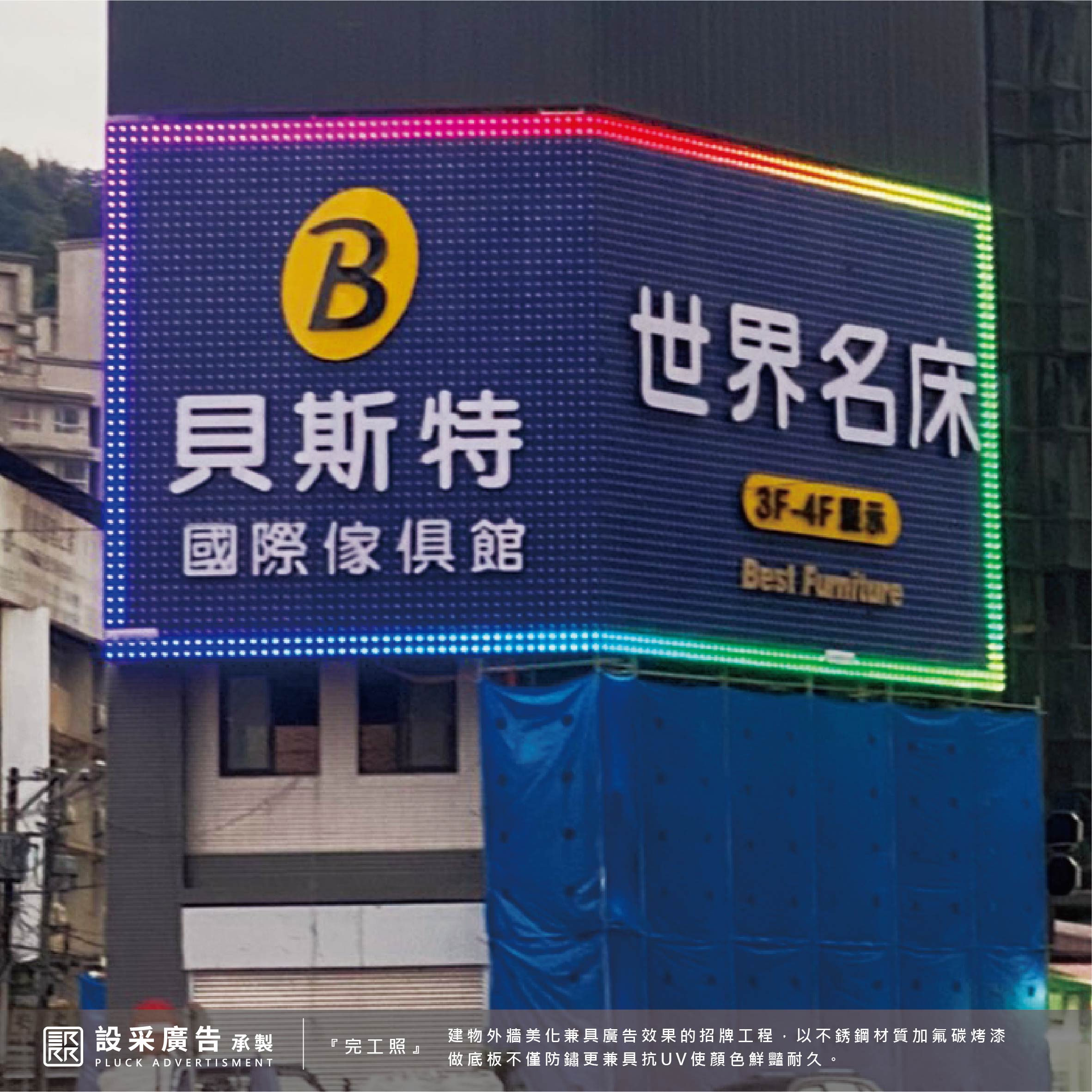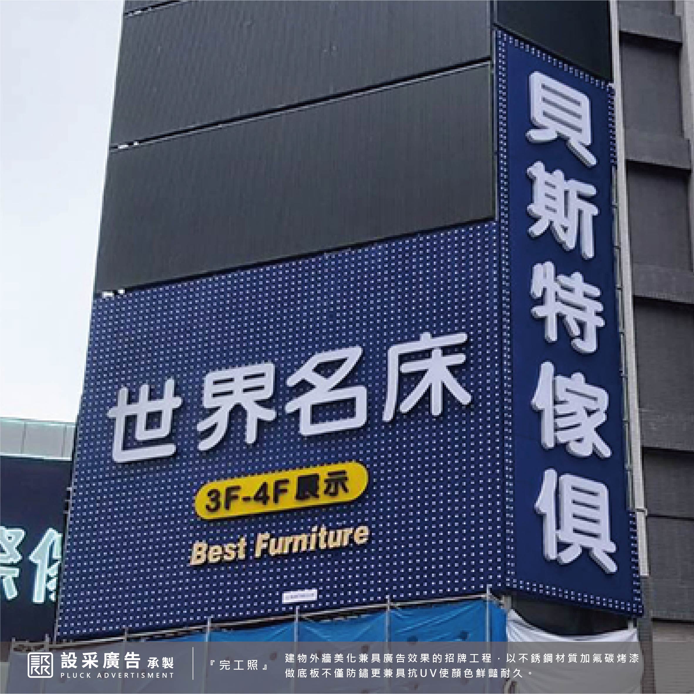 貝斯特國際傢俱館,地區最大賣場,找家具的好去處;老字號,一步一腳印、深耕台灣40年。位於新店七張捷運站(1號出口步行7-10分鐘)周邊也有高架道路經過,視野絕佳,因此希望可以於大樓外牆設置顯眼招牌。