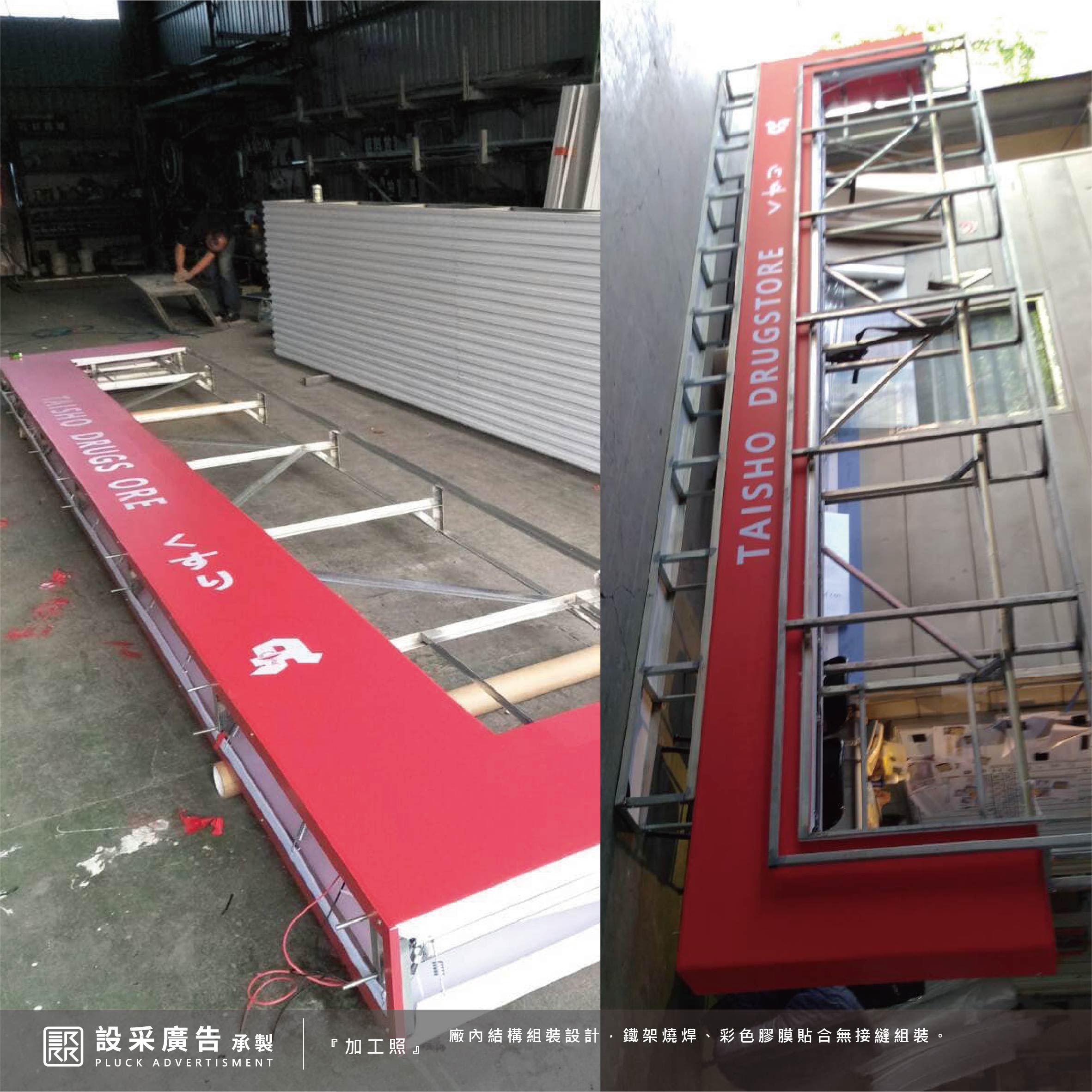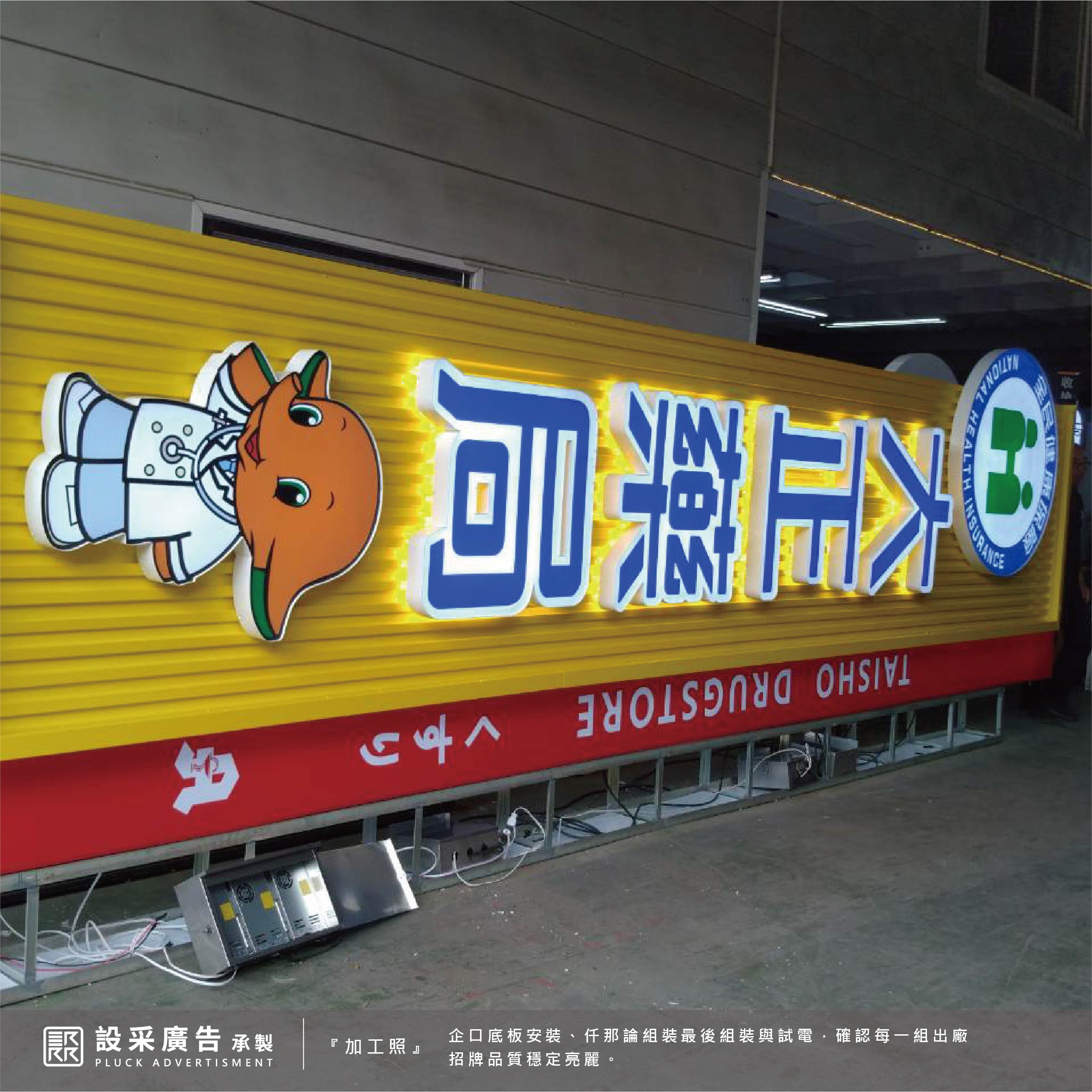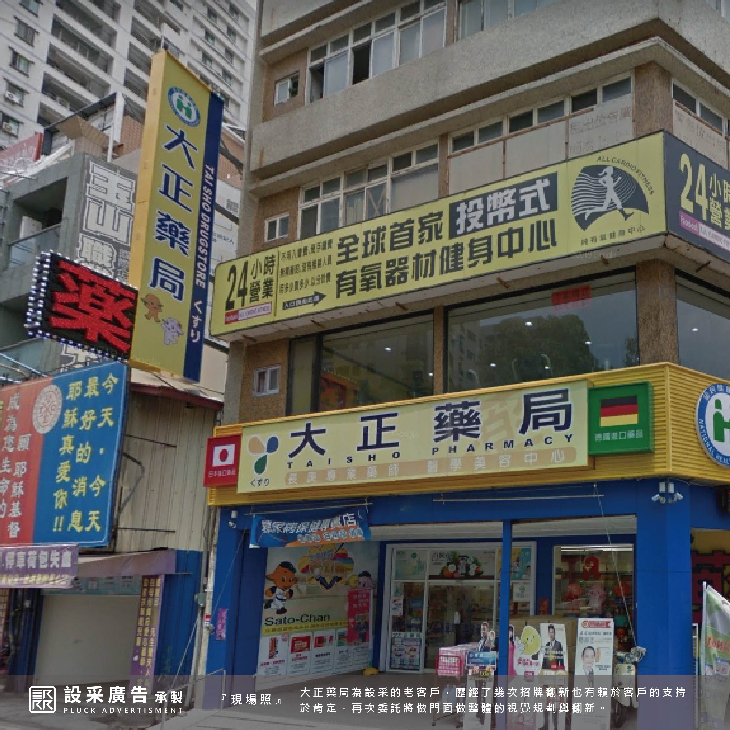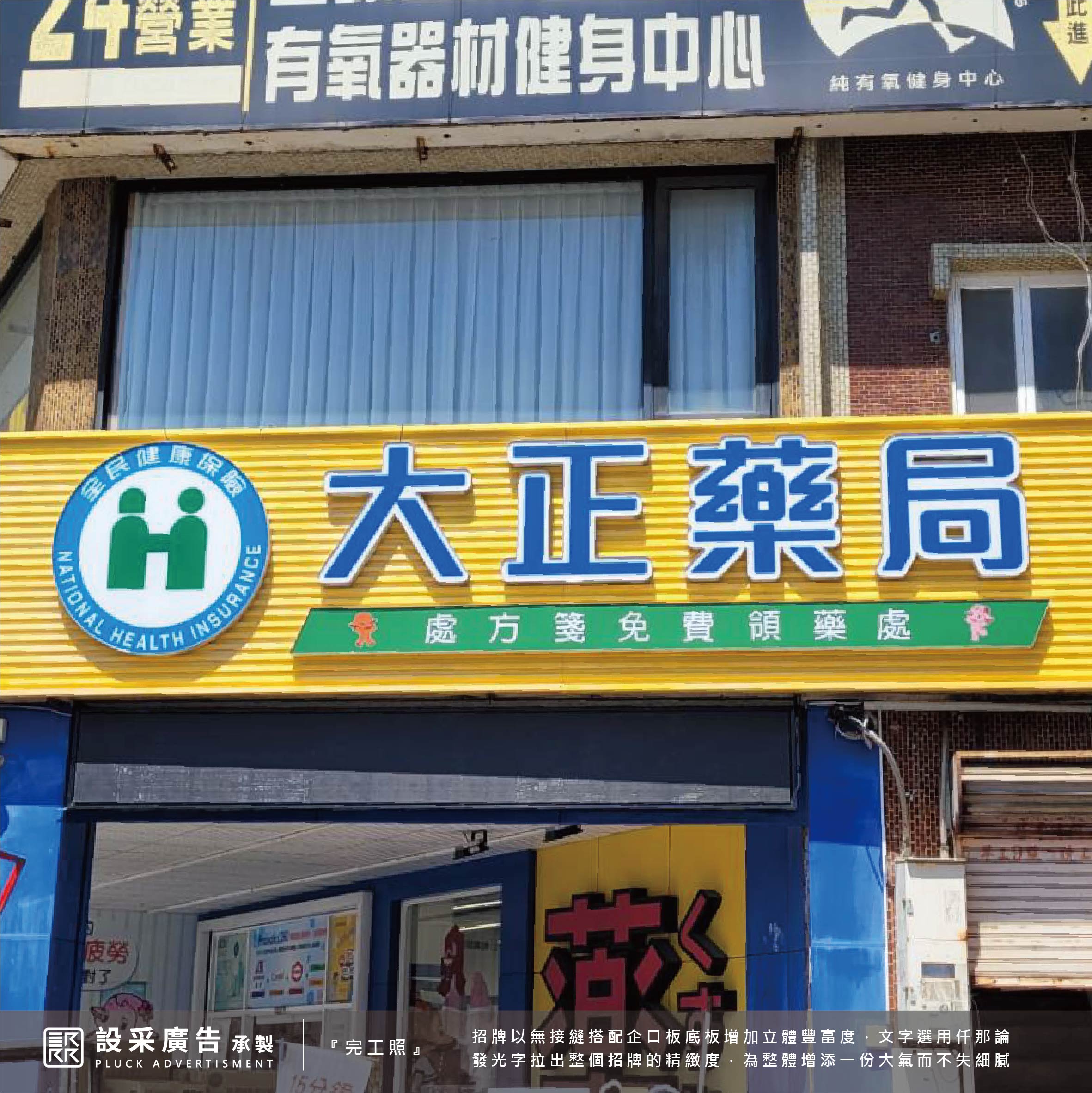 大正藥局為設采的老客戶,歷經了幾次招牌翻新也有賴於客戶的支持與肯定,再次委託將做門面做整體的視覺規劃與翻新。本次工程施作一樓面招、直招搭配無接縫燈箱與立體造型結構,呈現活潑與專業兼具,最重要的品牌識別標誌使用仟納論立體字展現品牌大器與質感。
